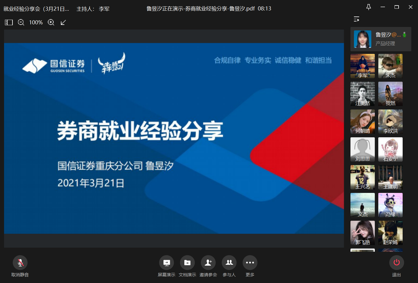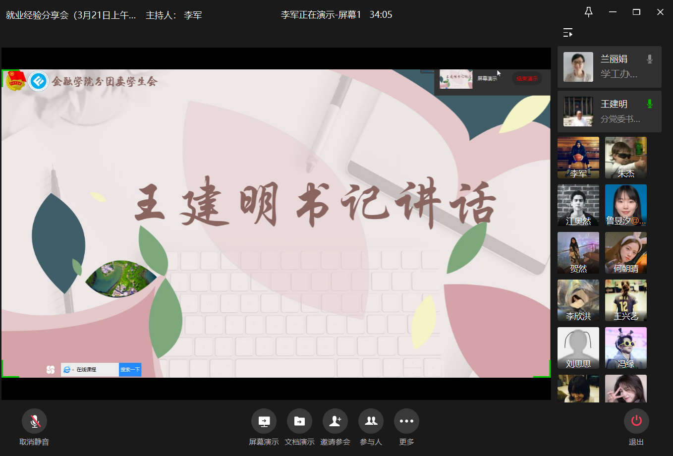 3月21日上午10:00,76net必赢线路检测中心就业经验分享会于企业微信成功举办。本次活动邀请到国信证券股份有限公司的12级CFA专业鲁昱汐、广发银行股份有限公司的16级金融五朱杰、德勤华庆商务服务有限公司的16级投资二冷小兰、中汇国际保险经纪公司的16级保险一文思力进行就业经验分享。76net必赢线路检测中心党委书记、副院长王建明,76net必赢线路检测中心党委副书记、纪委书记余新,以及76net必赢线路检测中心一百多名同学参加了会议。