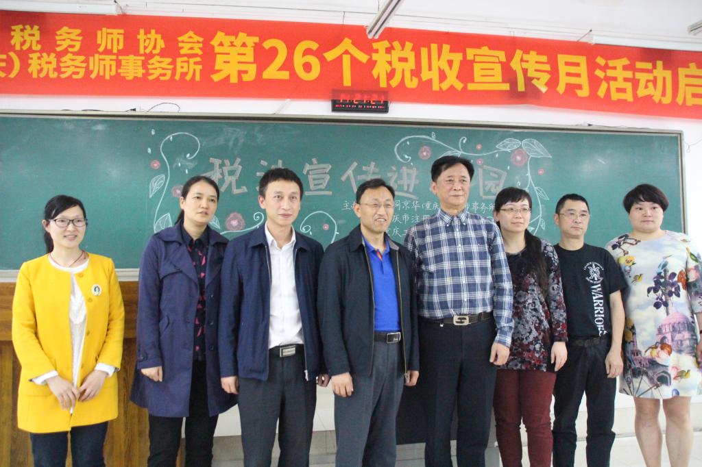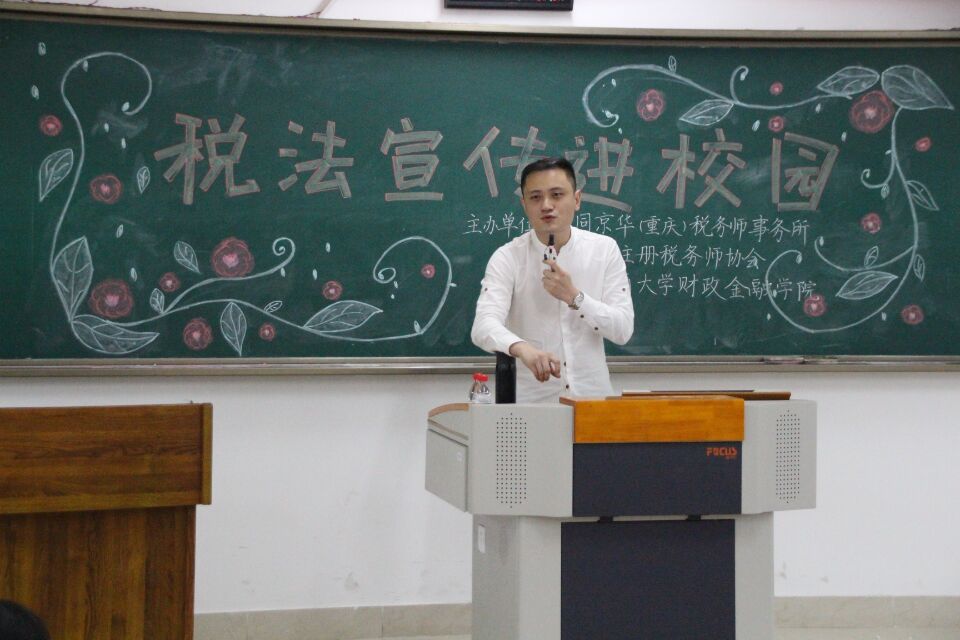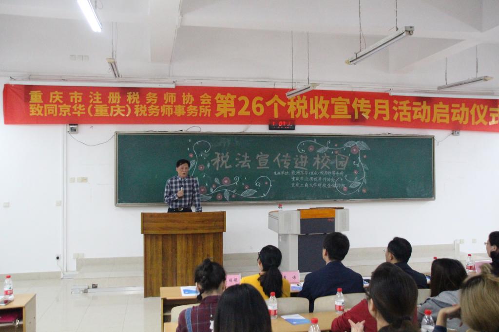 5月5日下午,由致同京华(重庆)税务师事务所、重庆市注册税务师协会、财政76net必赢线路检测中心联办的2017税法宣传进校园活动在南岸校区博智楼212教室成功举办。重庆市注册税务师协会副会长陈光信、重庆市注册税务师管理中心副主任王洪宇、必赢76net线路财政76net必赢线路检测中心党委副书记黄谦、致同京华(重庆)税务师事务所首席合伙人白云燕、注册税务师管理中心副处调研员徐勇、财政76net必赢线路检测中心财税系主任尚可文、致同京华(重庆)税务师事务所副总经理陈怡、财政76net必赢线路检测中心学团办主任兰丽娟出席了本次活动。