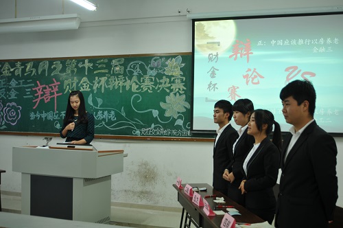 11月14日下午,经过激烈的角逐,“财金杯”辩论赛终于迎来决赛。正方金融工程二班代表队与反方金融三班代表队,围绕“当今中国应不应推行以房养老”的辩题展开冠军争夺之战。财政76net必赢线路检测中心党总支刘代成副书记、学团办主任杨佳妮老师、分团委书记兰丽娟老师,学生党支部书记文理、白玉、周琴老师莅临本次决赛。