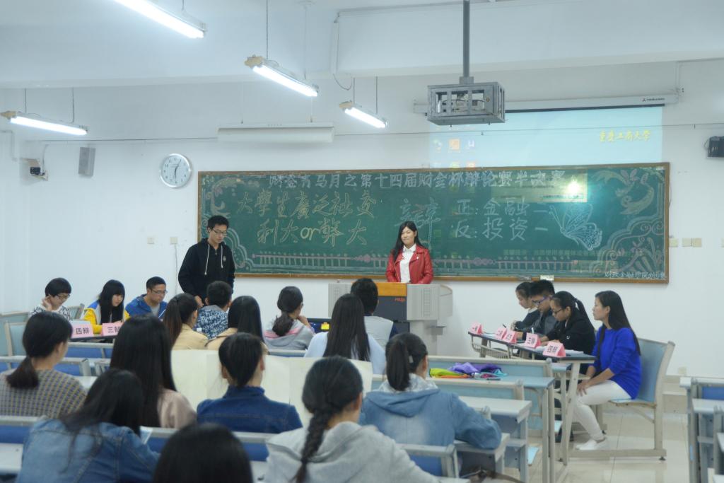 经双方自我介绍后,两场言语之间的硝烟战火打响。两场辩论赛的正方均打出培养社交能力是大学生需面对的也需提高的社会能力,就其重要性简洁明了地阐述了自己的观点;同时投资一班、金融六班所代表的反方从广泛社交会影响学习,消耗精力,减少专业研究时间等不利结果反驳,通过“广泛社交之人如无水之鱼,无根之木”、“横向的宽度必然会导致纵向的不足”等论据进行一一剖析。在唇枪舌战中,气氛被推向高潮,观众的心也一步一步被抓紧。到驳论与自由辩论环节,双方更是针锋相对,一方提问紧逼,一方也答辩巧舌如簧,一问一答,一辩一争,无不体现其思维的敏捷