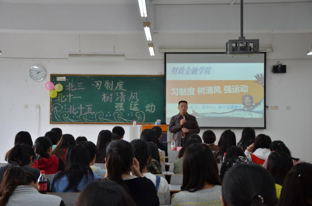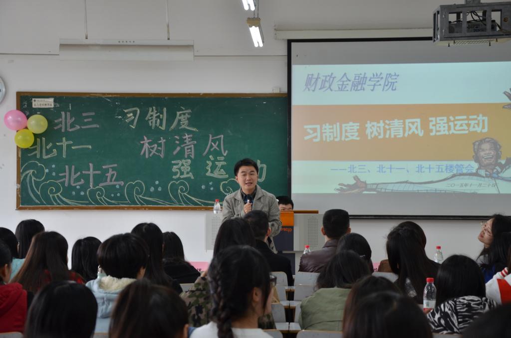 2015年11月20日,北三、北十一、北十五楼管会在7401教室和北操排球场联合举办了以“习制度、树新风、强运动”为主题的公寓特色活动。财政76net必赢线路检测中心党总支副书记刘代成、分团委书记徐阔老师、学生第四党支部书记余红霞老师以及北三楼管会指导老师文理老师,北十一、北十五楼管会指导老师范乐乐老师出席活动。