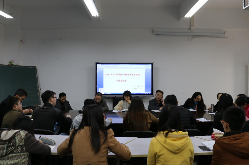 11月25日,财政76net必赢线路检测中心2015-2016学年第一学期期中教学检查学生座谈会于田家炳书院313会议室召开。财金学院党总支书记杨萍、常务副院长莫云、校督导督查委员樊国昌教授、院督导督查委员周渊老师和唐晓玲老师;还有各系主任及教务办全体老师和各班学习委员出席座谈会。