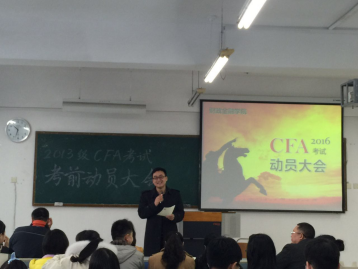 大会首先由李云龙先生对目前同学们的情况进行总结,并对同学们进行了鼓励,希望大家调整心态,投入到考试复习中,积极备考。然后,莫云副院长就开学举办的CFA知识竞赛进行了总结,公布获奖名单,同时鼓励同学们再接再厉,在接下来的时间里取得更优异的成绩。紧接着毛跃一副院长宣布了学院关于CFA项目激励机制管理办法,使同学们学习的积极性进一步提高。随后的时间,融仕国际的两位讲师程老师以及滕老师先后发言,为同学们强调了CFA学习的重点和方法,并鼓励大家全身心投入到复习,努力取得好的成绩。之后,12级CFA的龚会淋同学结合自身经历,为同学们总结了复习的关键的方法,让同学们获取了更多的经验来准备接下来复习。13级CFA学生代表南方杰同学也代表全体13级同学发言,表明了同学们在未来备考和考试中的决心的信心,争取创造一个更优异的成绩。最后杨萍书记进行总结讲话,通过四句话总结了对于同学们和要求和期待,并希望同学们都能取得满意的成绩。
