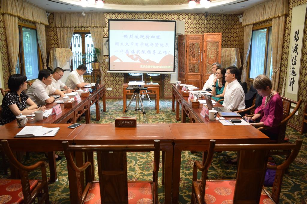 何校长首先介绍了学校的基本情况、主要优势、特色以及未来发展思路,特别是谈到了与新加坡国立大学合作的愿望和合作思路。杨贤院长介绍了新加坡国立大学基本情况,表达了强烈的合作意愿,特别是重庆76net必赢线路检测中心聘请他为副理事长,非常荣幸,深感责任重大,此次专程到重庆和学院,就是希望深度加强合作。