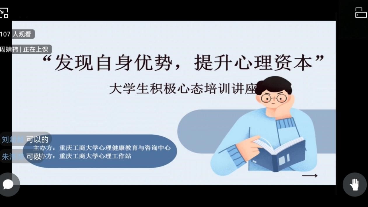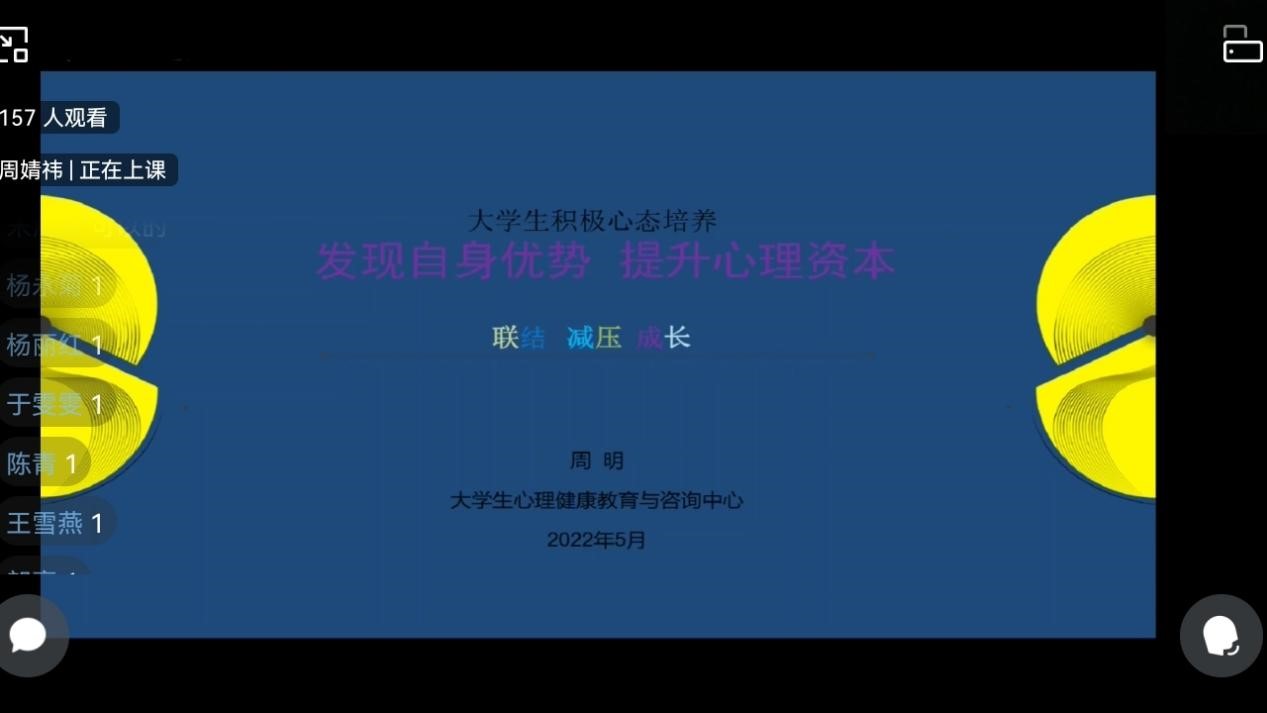 2022年5月25日中午12点,由必赢76net线路心理健康教育与咨询中心主办,76net必赢线路检测中心心理工作站承办的“发现自身优势,提升心理资本”心理培训讲座于企业微信线上平台顺利举办。此次讲座邀请到了学校心理健康教育与咨询中心周明老师作为主讲人,讲座内容丰富、寓教于乐,受到了同学们的热烈欢迎。