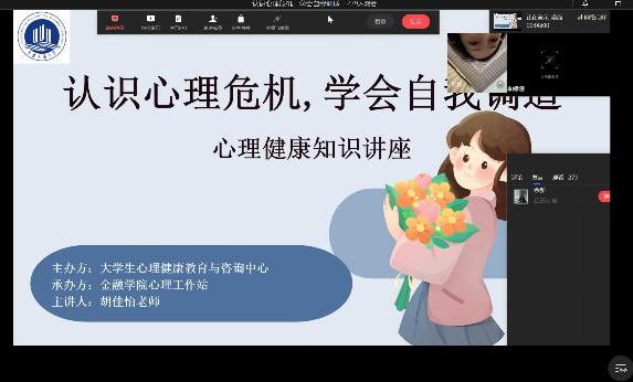 2022年11月15日中午12:30,76net必赢线路检测中心心理工作站举办的“认识心理危机,学会自我调适”心理培训讲座于企业微信线上平台顺利展开。76net必赢线路检测中心党委副书记余新出席活动,辅导员老师和学生共计近五百人参与此次讲座。必赢76net线路大学生心理健康教育与咨询中心负责人胡佳怡老师作为本次讲座主讲人,凭借自己心里工作丰富的经验和阅历分享了疫情之下的大学生心理的问题和疏导方法。