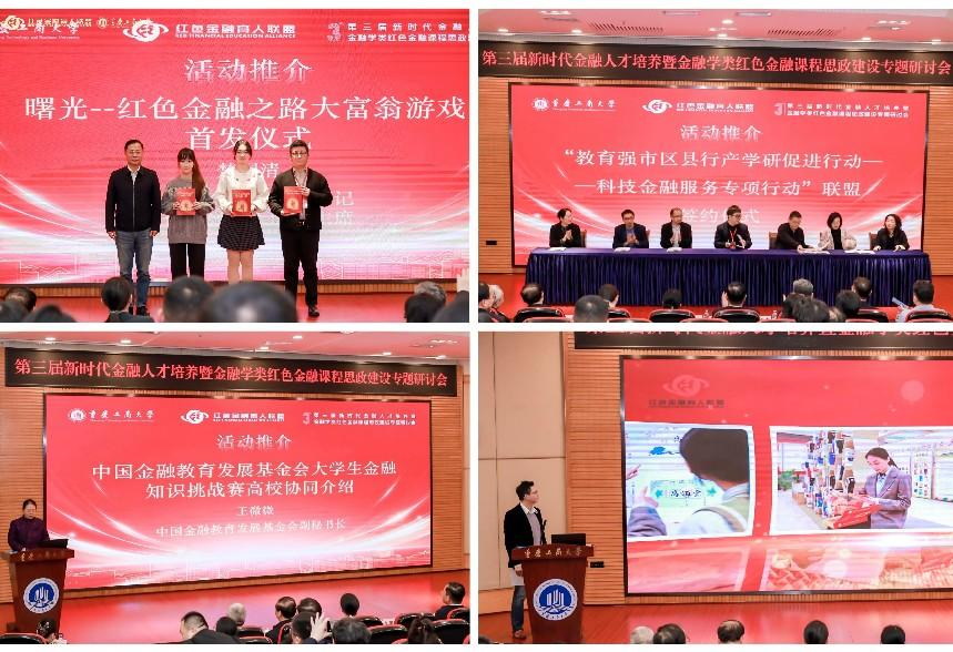 红色金融育人活动介绍与发布环节由必赢76net线路副院长贺渝主持,与会代表共同见证了“教育强市区县行产学研促进行动——科技金融服务专项行动”联盟签约仪式;中国金融教育发展基金会大学生金融知识挑战赛活动介绍;“弘扬长征精神 赓续红色血脉 百校万人主题活动”推介;“曙光—红色金融之路”大富翁游戏首发仪式等;楚国清向联盟会员代表赠送了由北京联合大学金融专硕学生开发设计的红色金融文创产品。