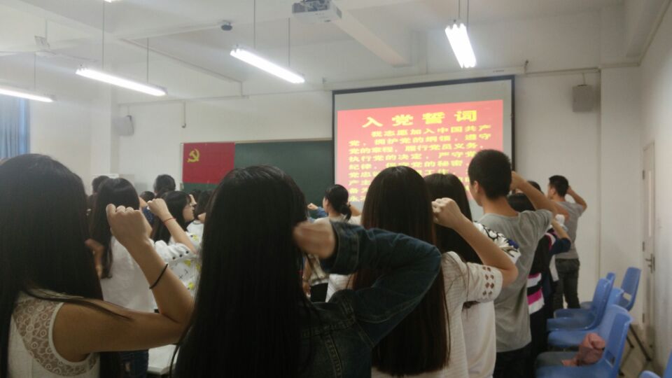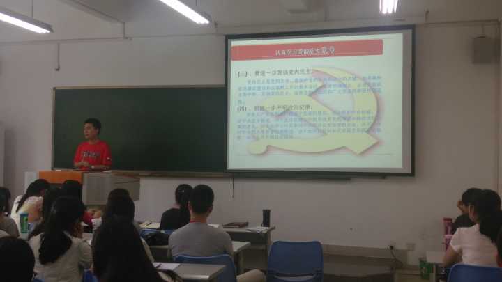 会议第二项:“两学一做”的学习教育活动启动仪式。首先由学生一支部支部书记文理老师对“两学一做”活动的内容作出介绍和讲解,即学习中国共产党的党章党规,学习贯彻习近平总书记系列重要讲话精神,做一名合格的党员。同时用PPT课件的形式展示介绍了党的基本知识,例如:党规党章,及习总书记系列讲话。并提出开展“两学一做”,“学”是基础关键。全体党员通过学习弄清楚该做什么,不该做什么,能做什么,不能做什么,明白作为一名党员的基本要求。文老师还对今后的“两学一做”的相关主题学习做出了详细安排。要求支部成员首先深入学习了解党的规章制度,明确基本目标,树立行为规范。其次,要学习习近平总书记多次的系列讲话精神,加强理论武装,自觉强化看齐意识。同时也强调了“做”是行动关键。要将学习成果落到实事,以知促行,做讲政治,讲信念,讲规矩,有记律,讲道德,有品行,讲奉献,有作为的学生党员。