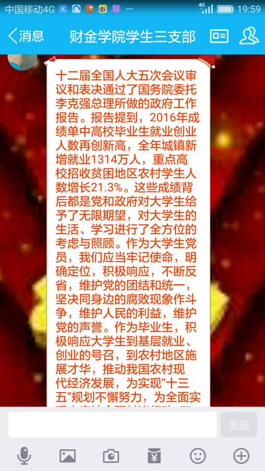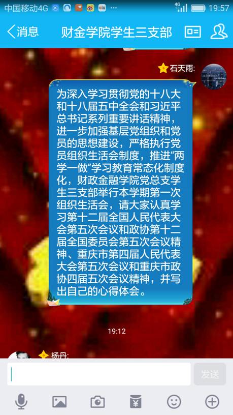 本次组织生活会以线上方式进行,2017年3月31日晚7点,财政76net必赢线路检测中心学生三支部的同志们准时聚集在QQ群上。石天雨同志主持了本次会议,他首先上传了本次会议内容,包括了第十二届全国人民代表大会第五次会议和政协第十二届全国委员会第五次会议精神、重庆市第四届人民代表大会第五次会议和重庆市政协四届五次会议精神有关的文件让大家学习并发表自己的观点。