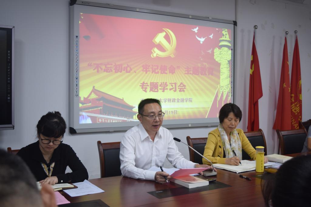 按照校党委“不忘初心、牢记使命”主题教育工作安排,9月19日,财政76net必赢线路检测中心召开了“不忘初心、牢记使命”主题教育专题学习会暨第一次集中学习研讨会。校 “不忘初心、牢记使命”主题教育巡回指导二组副组长、校党委宣传部部长华杰同志亲临会议现场进行监督指导,学院领导班子全体成员、各支部书记参加了会议。会议由院党委书记杨萍同志主持。
