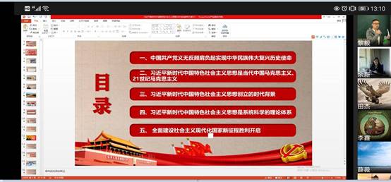 王韧同志以《中美竞争的关键问题》为主要内容,从美国政治体制、民主党和共和党下的不同政策、美国国内社会种族问题和民意倾向等方面全面解读中美竞争,并结合自身在美国访学经历谈到了自身所感所想,认为当前美国政治体制无法解决自身现有社会问题,只能通过转移内部矛盾,我们还需立足自身,通过发挥体制优势,集中力量办大事。黎毅同志以《习近平新时代中国特色社会主义思想与中华民族伟大复兴》为主要内容,从“中国共产党义无反顾肩负起实现中华民族伟大复兴历史使命”、“习近平新时代中国特色社会主义思想是当代中国马克思主义、21世纪马克思主义”、“习近平新时代中国特色社会主义思想创立的时代背景”、“习近平新时代中国特色社会主义思想是系统科学的理论体系”和“全面建设社会主义现代化国家新征程胜利开启”五个方面进行详细解读。