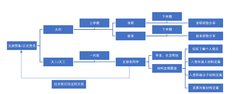 新形势下,76net必赢线路检测中心学生二支部首次创新“党员学长制”制度,使入党流程形成规范化、程序化、透明化管理,通过大二、大三党员“一对一”、“一对多”的分配模式,开展以全体76net必赢线路检测中心学生班级为单位的“学业帮扶”、“入党材料跟进”活动。同时,“党员学长制”定期开展“大四党员学长考研就业分享会”,深入践行入党初心,为群众办实事的使命。