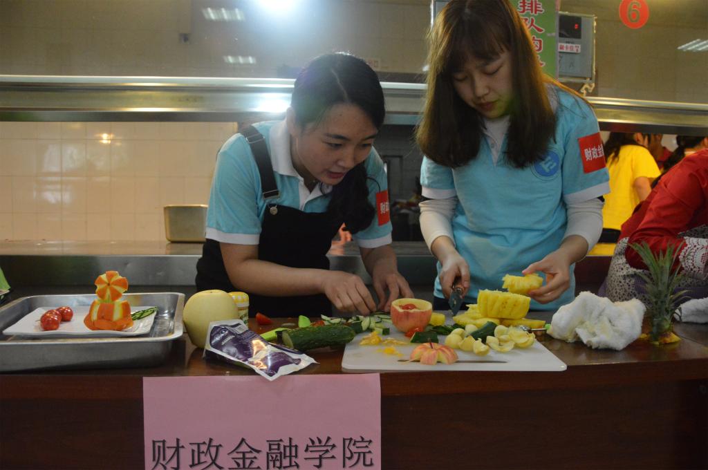 比赛开始前,现场观众就十分热情,期待选手们带来的美食盛宴。在主持人的随机采访中,财金啦啦队有幸被第一个采访并高声喊出了学院的口号:财金美食,别具匠心;余香缭绕,沁人心脾。一轮采访后,主持人介绍到场嘉宾,比赛便正式拉开帷幕。各个学院分为三组,轮番上阵,每队中两人负责菜品烹饪,另两人则负责水果拼盘;选手们在二十分钟内大展身手,秀尽厨艺,做出了一道道香喷喷的菜肴和精美的水果拼盘。其间,观众们在享尽眼福、口福的同时,也积极参与互动。惊险的吹气球单人比赛、高难度的吃薯片比赛、考验默契的画画猜意比赛等得到观众的热情参与。最终,财政76net必赢线路检测中心获得92.28分的好成绩。