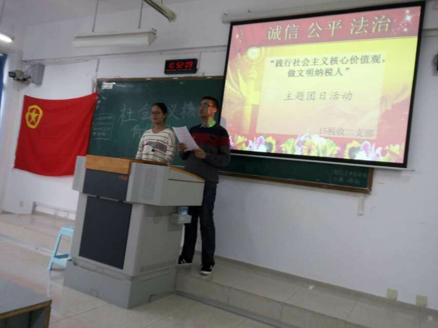 为积极响应党中央的号召,根据上级文件精神,结合学校实际情况,15级税收二支部于2016年10月21日组织学生在博智楼203教室开展了形式多样的“培育和践行社会主义核心价值观”主题教育团日活动。