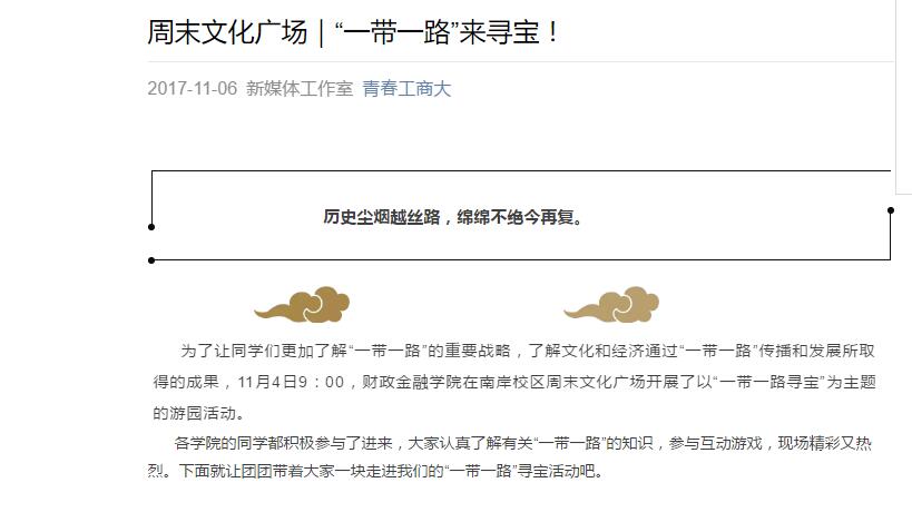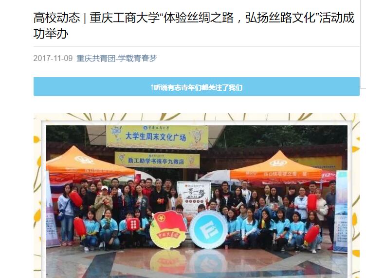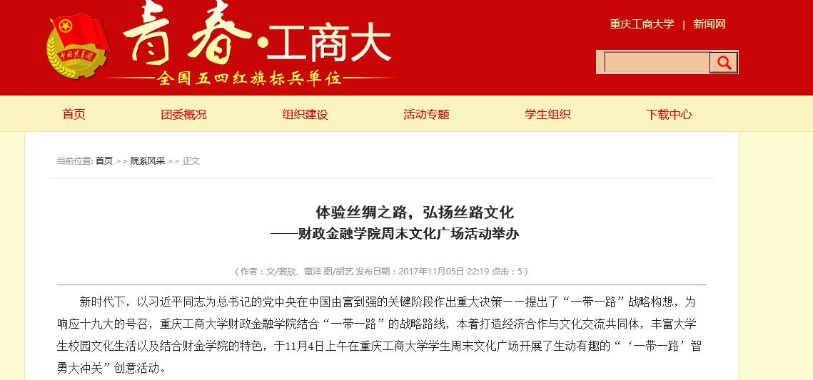 为在新时期弘扬丝路精神,丰富大学生校园文化生活,必赢76net线路财政76net必赢线路检测中心结合“一带一路”的战略路线与财金特色于11月4日上午在大学生周末文化广场举办了以追寻丝路文化为主要内容的“一带一路”智勇大冲关活动,受到校内外媒体的广泛关注。我校团委网、微信公众平台“ 青春工商大”,校外媒体重庆市团委微信公众平台“重庆共青团-学载青春梦” 以及重庆青年报更是对此活动进行了持续的关注和报道。