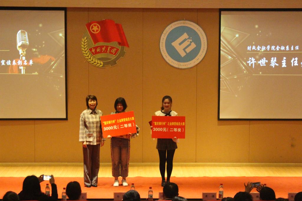 财金舞蹈队以婀娜曼妙的舞姿为大会拉开了帷幕,与会人员一同在总结视频中回顾选手们一路走来的优秀表现与酸甜苦辣,三个月的营销历程历历在目。随后,学院党委副书记黄谦发表讲话,表达了对重庆银行以及学院各领导大力支持的感谢,祝贺参赛选手在比赛中取得优异成绩,他还强调此类学科竞赛为学院金融专业的长足发展有重要意义;随后,陆勇先生在发言中肯定了重庆银行与财金学院架构实践桥梁的意义并对各参赛选手在重庆银行各营业网点的优异表现给予高度评价,感谢他们的辛勤付出为重庆银行年度业绩奠定了良好基础。在激动人心的颁奖环节,况娴、周悦等10名同学获得优秀奖;曾永家左、秦雨凡、蔡进获得三等奖;李璨婷、幸夕获得二等奖;杜朝阳凭借出众的营销技能和坚持不懈的精神勇夺大赛冠军。
