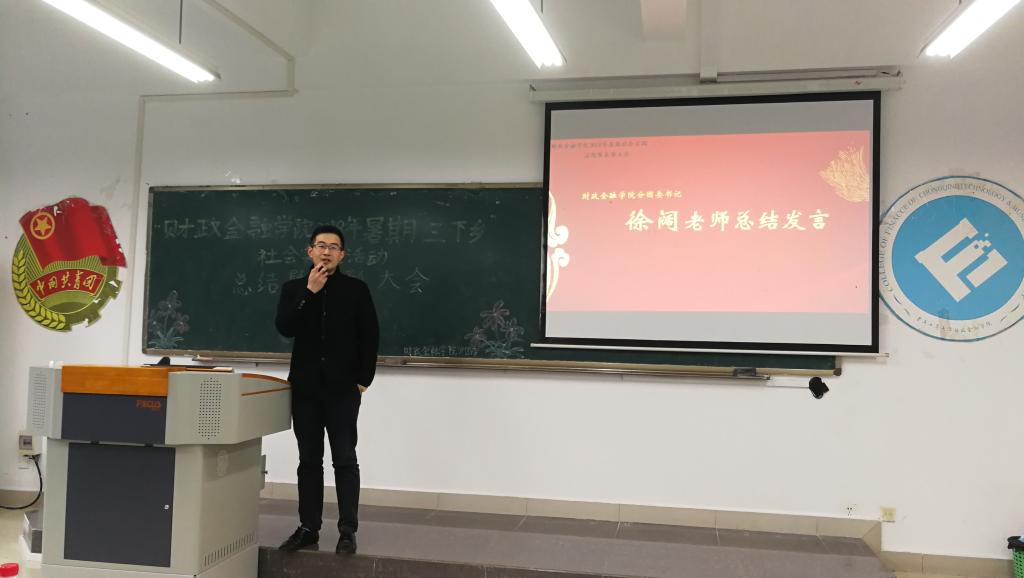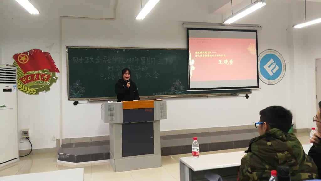 首先,徐阔老师上台对社会实践活动进行总结发言,对各实践分队给予了充分肯定和高度赞扬的同时,还提出两点希望:他希望社会实践要继续以宣传贯彻习近平新时代中国特色社会主义思想为主线,推动党的十九大精神进农村、进社区、进企业;他希望坚持社会实践主题要扩展到社会的方方面面,调动学生学习技能和本领的积极性,奠定坚实的工作基础,为实现伟大复兴的中国梦贡献青春力量。随后,财政76net必赢线路检测中心分团委学生会主席林哲苏同学上台分别从四个方面汇报了2018年学院社会实践总体情况,他还向大家展示了此次实践活动的荣誉并总结活动中的不足。 紧接着,来自九龙坡“暑期嘉年华”支教小分队负责人高明同学以及院级代表队——渝北国情社情调研小分队队长王晓童同学对暑期社会实践进行了分享交流,他们在老师的指导下,走进九龙坡区金凤镇支教、进入基层探访调研、深入乡村寻求问题,使学生们感受到了改革开放40年来祖国繁荣昌盛,更加坚定理想信念,争做新时代先锋。最后,财政76net必赢线路检测中心分团委书记徐阔老师、财政76net必赢线路检测中心分团委(学生)副书记书记陈露同学分别为受表彰学生代表颁发荣誉证书,激励同学们弘扬社会实践精神,传承财金良好风尚。