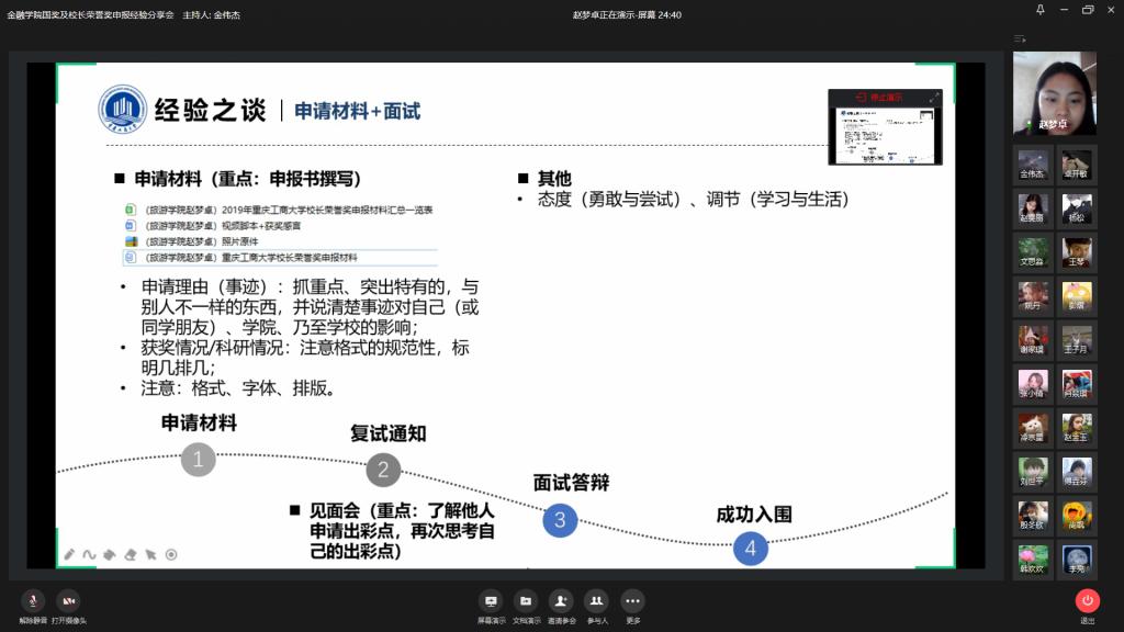 2020年9月12日上午10:00,76net必赢线路检测中心国奖及校长荣誉奖申报经验分享会于企业微信准时召开。出席此次分享会的有76net必赢线路检测中心党委副书记余新书记以及辅导员老师,两位曾获得过校长荣誉奖的优秀学姐,以及76net必赢线路检测中心的一百多位同学。
