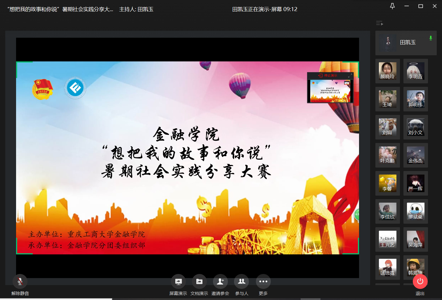 大赛初始,兰老师致辞,她表示多少次“听说”都不如一次亲历,鼓励同学们多多参与社会实践,更好提升综合素质,同时也预祝本次比赛顺利开展并能增加大家对实习实践的体悟。王纪越同学通过新领航计划与国联证券,坚定了学习证券的想法,提出要把握好每一次提升自己的机会;刘言、李德双、熊晓丽、陈红伶同学也分别讲述了她们在华泰证券、重庆三峡银行开州支行、浦发银行以及人寿保险的实习经历,表示实习在落实工作、回归专业的同时,也要保持学习习惯,掌握社会实践中的专业技能。叶克勤与黎玥同学的团队同时从环保角度出发,以实际行动为城市的清洁美丽做出贡献,并向他人传达了保护环境的想法,充分展示了大学生暑期志愿活动的风采。而后选手李德双、李馨、田红俏、陈罗以分别向大家讲述了其暑期三下乡实践活动的经历,纷纷表示在三下乡实践过程中练就了敢于直面困难的勇气并且坚持不懈的寻找解决方案,同时提升了与人交往能力与自主学习能力。最后,在观众提问环节上,不少同学关心并询问有关情况,表明了参与实践活动的意愿。分享结束后,主持人根据评选分数排名,李馨与王纪越同学荣获一等奖,李德双、陈罗以、陈红伶三位同学荣获二等奖,其余五位同学也取得了三等奖的好成绩。