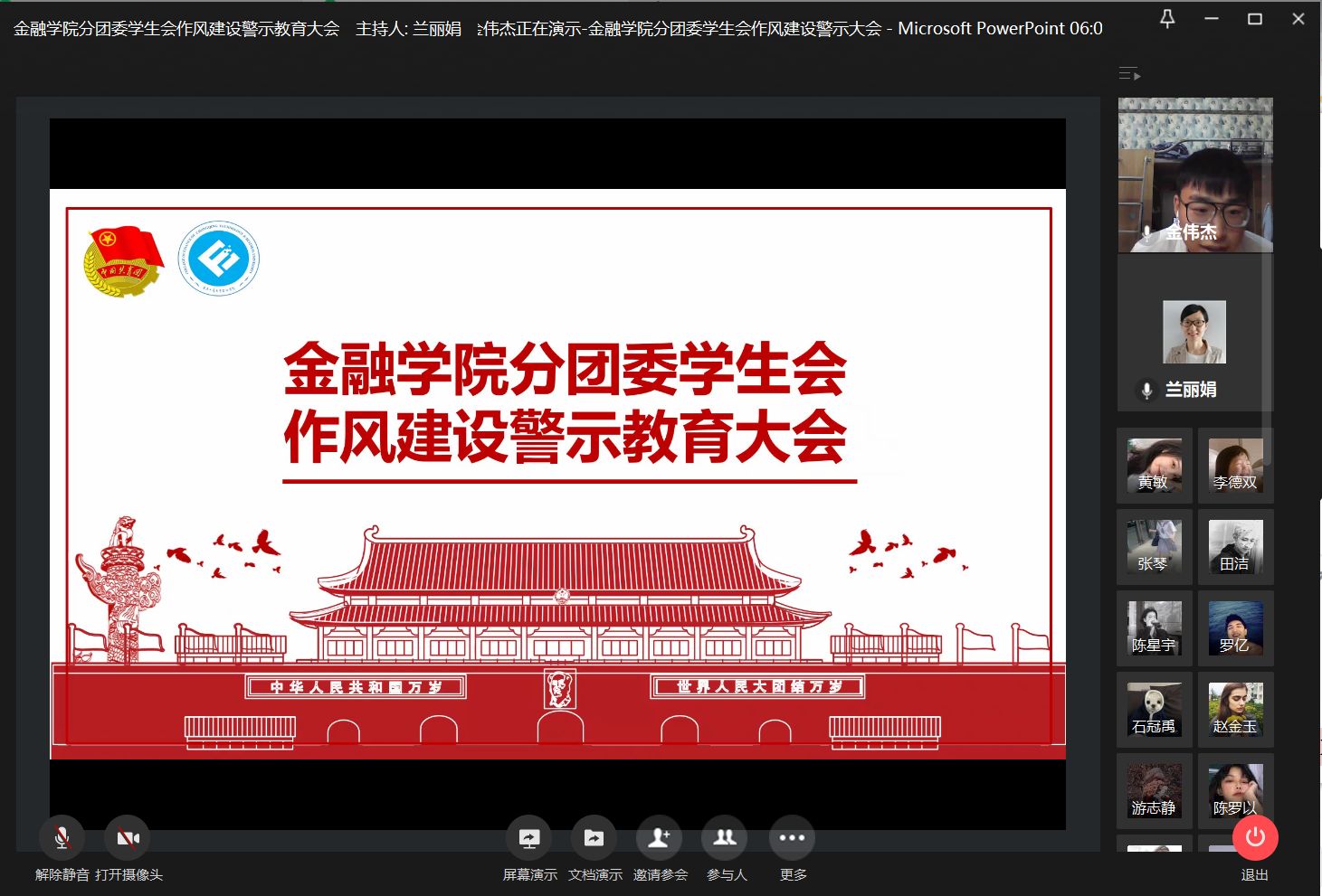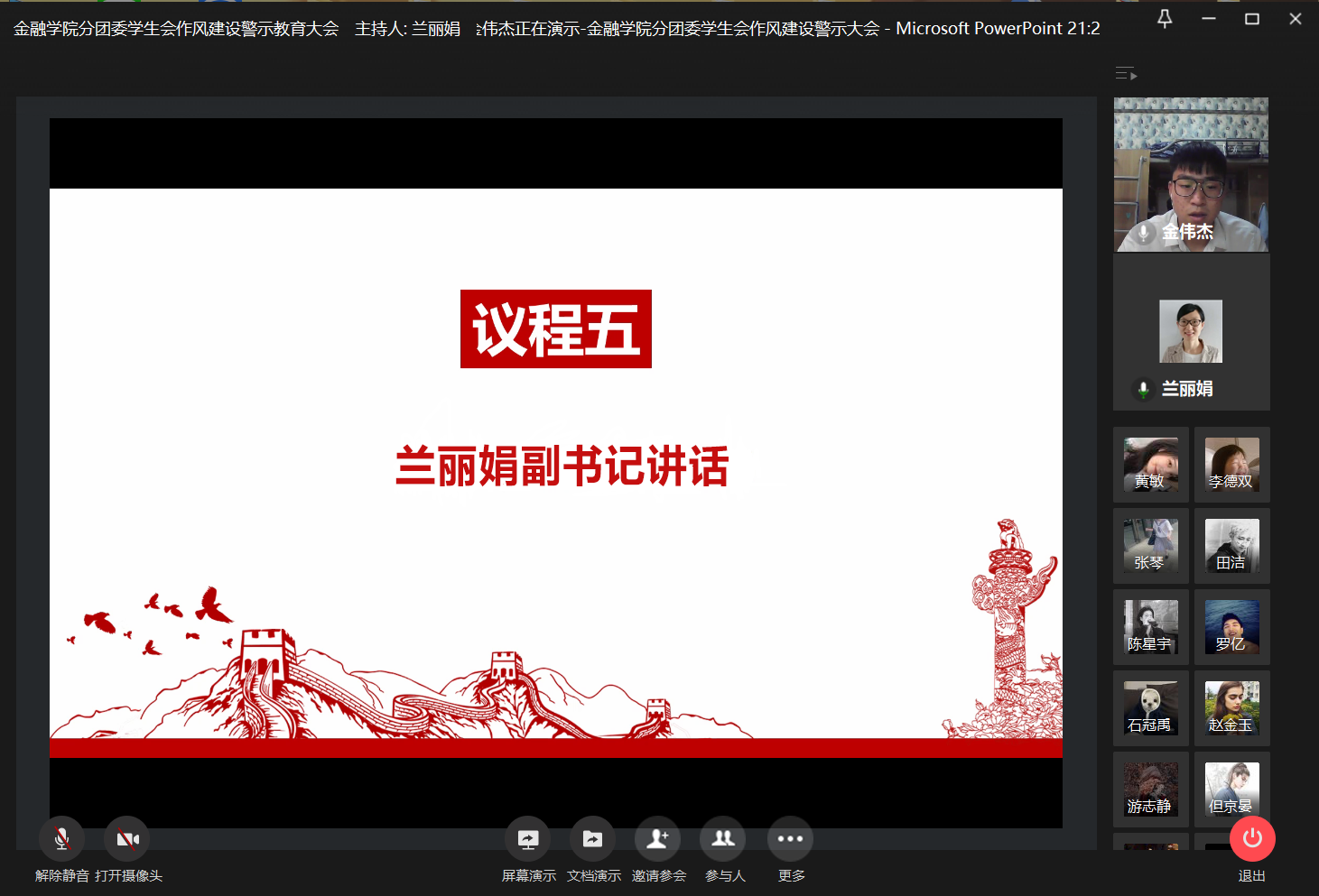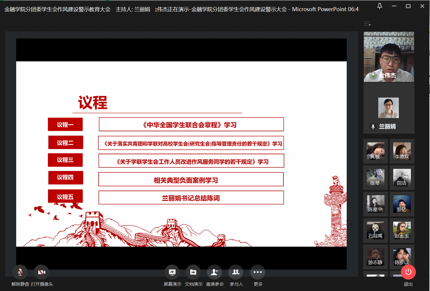 为加强学生干部作风建设,引导学生会和谐健康发展,2020年11月25日21:00,76net必赢线路检测中心分团委学生会于企业微信召开线上作风建设警示教育大会,学工办副主任、分团委副书记兰丽娟老师与学生会全体成员参与了本次大会。