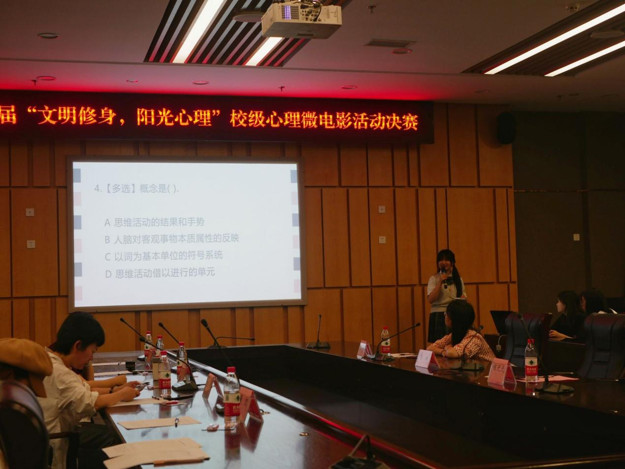 5月21日下午14:00,由学生处主办,76net必赢线路检测中心承办、文学与新闻学院协办的第十七届“文明修身,阳光心理”校级心理微电影大赛总决赛如期于必赢76net线路图书馆第五会议室举行。 此次比赛的目的是为了提高大学生的心理素质及适应社会生活的能力,培养大学生良好的个性心理品质,在全校范围内共同创造出“人人关爱心灵,处处青春洋溢”“彼此互帮互助,共同快乐前进”的氛围。