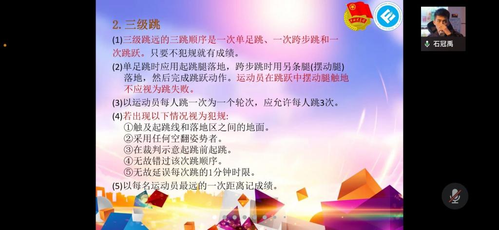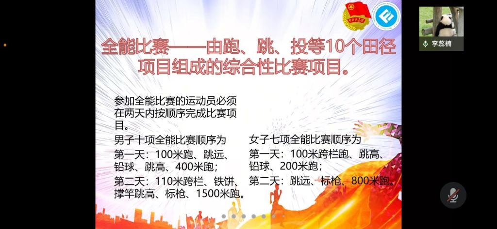 2022年3月18日19时,76net必赢线路检测中心体育技能培训大会在企业微信顺利举行。本次会议由76net必赢线路检测中心分团委学生会体育部部门负责人熊芯、石冠禹、李蕊楠分别对田径运动径赛、田赛、全能比赛进行介绍,旨在提高同学们的体育知识与技能。