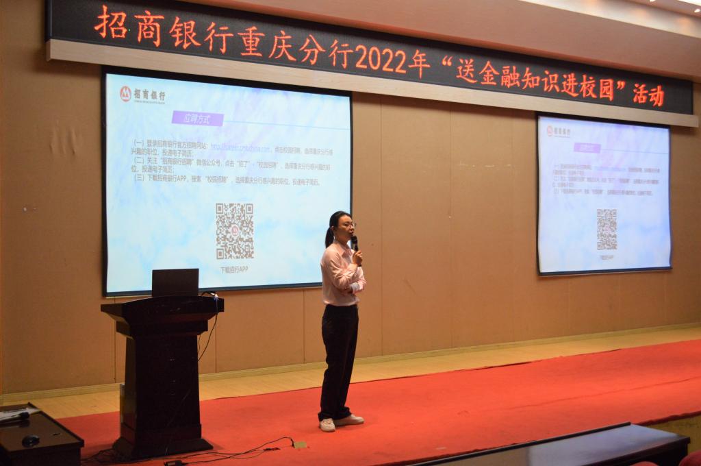 李馨怡则重点宣讲了招商银行及招商银行重庆分行的基本情况及校园招聘的岗位需求、基本申请条件、应聘方式和流程。她谈到,今年秋季招聘可能涉及的岗位包括运营柜员岗、市场营销岗、基础业务岗、金融科技岗,在招聘中更加看中学生的全面发展和综合素质,目前招商银行暑期实习生正在招募,欢迎同学们积极申报。