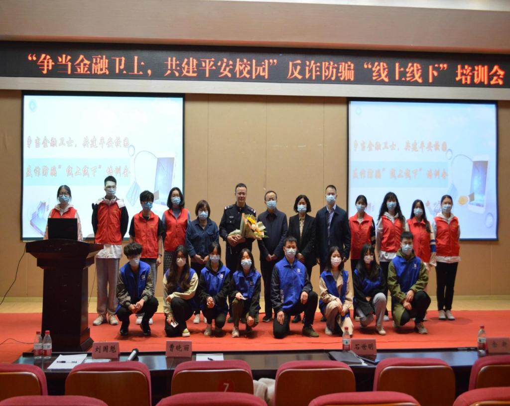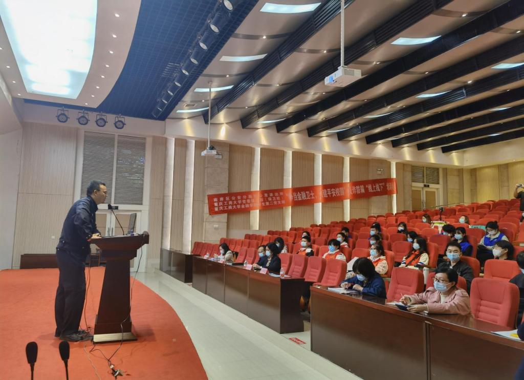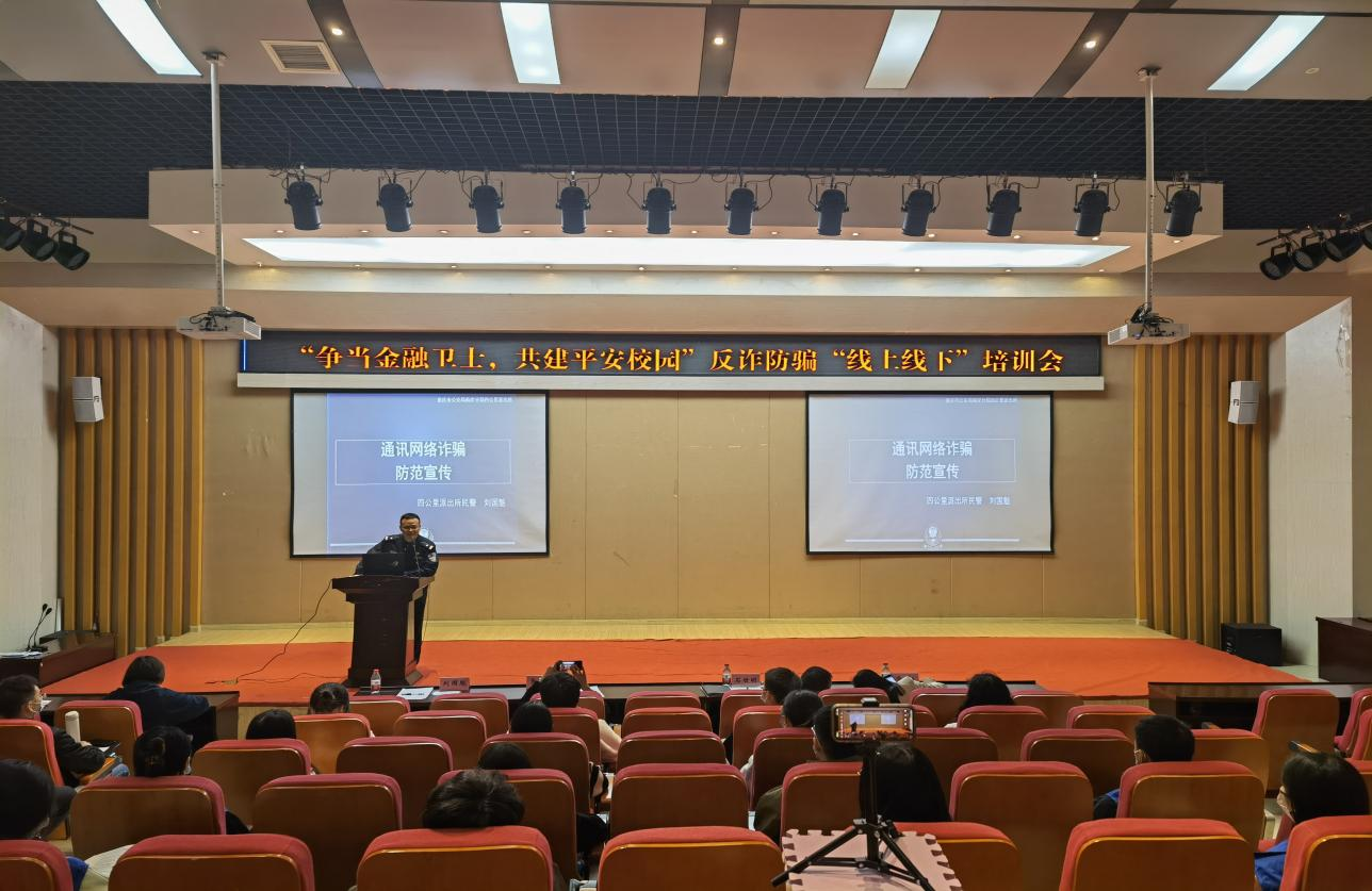 2022年10月28日,为普及防范诈骗知识,进一步提升学生的反诈防骗能力,南岸区公安分局四公里派出所、必赢76net线路党委保卫部(保卫处)以及76net必赢线路检测中心在田家炳209报告厅联合举行“争当金融卫士,共建平安校园”反诈防骗“线上线下”培训会。重庆市南岸分局四公里派出所警官刘国魁,校党委保卫部副部长(保卫处副处长)曹晓丽,76net必赢线路检测中心党委书记、副院长石世明,76net必赢线路检测中心党委副书记、纪委书记余新,76net必赢线路检测中心党委委员、专职组织员赵甫刚及全体辅导员老师出席了培训会。“金融卫士”团队及学生第二党支部(双创)代表参加了现场培训,其他同学同步线上观看直播。