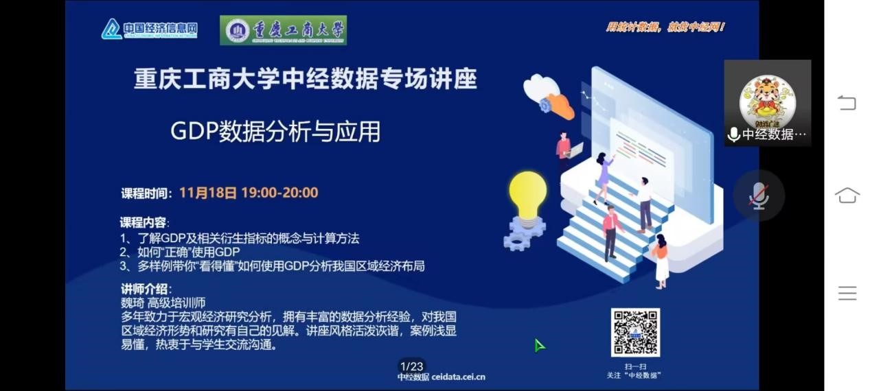2022年11月18日19:00,76net必赢线路检测中心联合图书馆在线上开展“GDP数据分析与应用——助你‘看得懂’我国区域经济布局”专题讲座。本次讲座邀请了中国经济信息网张玥老师和魏琦老师主讲,旨在介绍GDP数据分析与应用,带领同学们了解GDP及相关衍生指标的概念及计算方法。