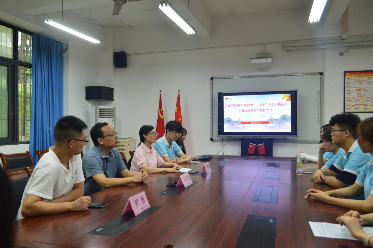 实干笃行正青春,普惠金融践初心。为扎实开展好学习贯彻习近平新时代中国特色社会主义思想主题教育,深入学习贯彻落实党的二十大精神,引领广大青年学生立志做有理想、敢担当、能吃苦、肯奋斗的新时代好青年,76net必赢线路检测中心积极推进暑期“三下乡”社会实践活动。7月6日中午,76net必赢线路检测中心2023年暑期“三下乡”社会实践活动出征仪式暨安全教育大会在田家炳317会议室及线上同步举行。76net必赢线路检测中心党委书记、副院长石世明,党委副书记、纪委书记余新,学工办主任、分团委书记兰丽娟、学生第一党支部书记罗勇及各实践团成员参加了会议。