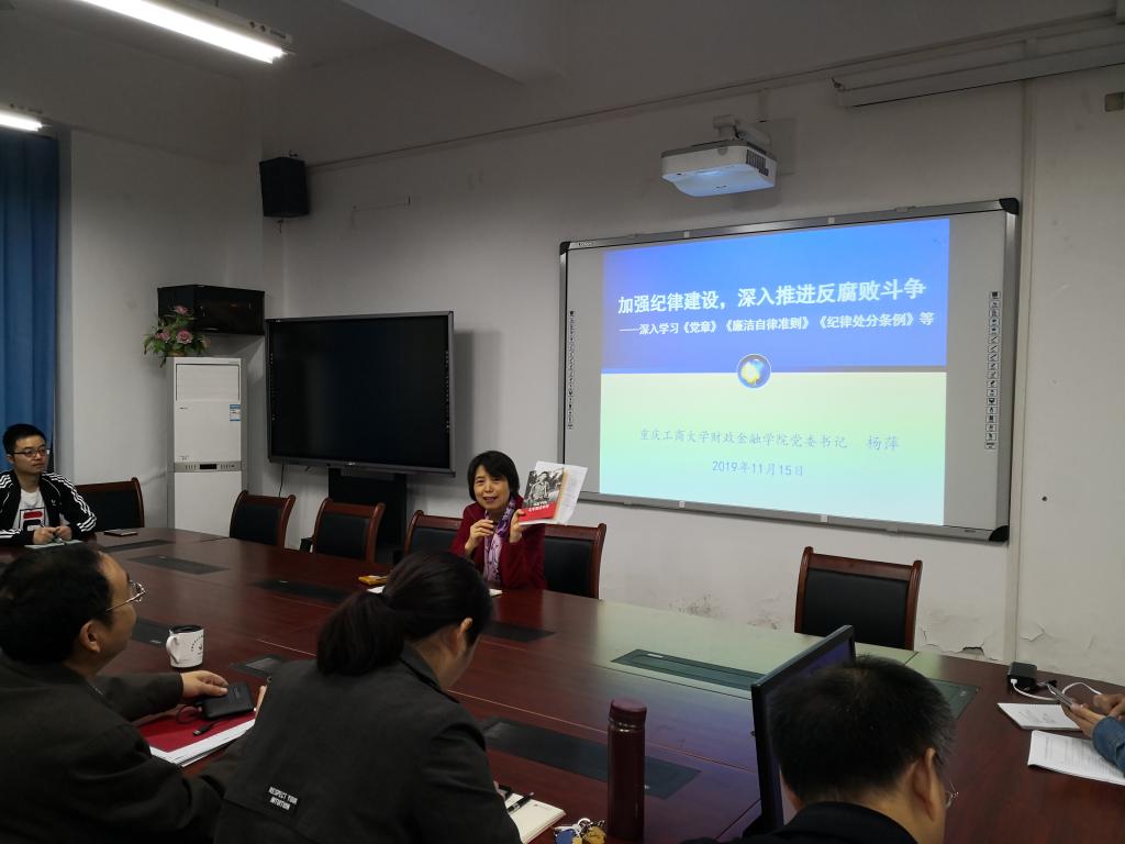 党委书记杨萍主讲题目是《加强纪律建设,深入推进反腐败斗争》。她梳理了建党以来我党对纪律建设的各项要求和论述,并指出:中国共产党从来是一个有伟大理想和严明纪律的党,在长期革命、建设和改革的实践中,党的纪律逐渐形成、发展和完善,是实现党的路线、方针、政策的可靠保证,是维护党的团结、统一的有力武器,是保持党的先进性和纯洁性的重要条件。全院党员教职工要认真领会“不忘初心、牢记使命”主题教育思想,牢固树立科学的世界观、人生观和价值观,无论党员干部和一般群众都要正确对待手中的“权力”,潜心教学、科研、管理工作,立德树人,全员育人、全程育人、全方位育人。
