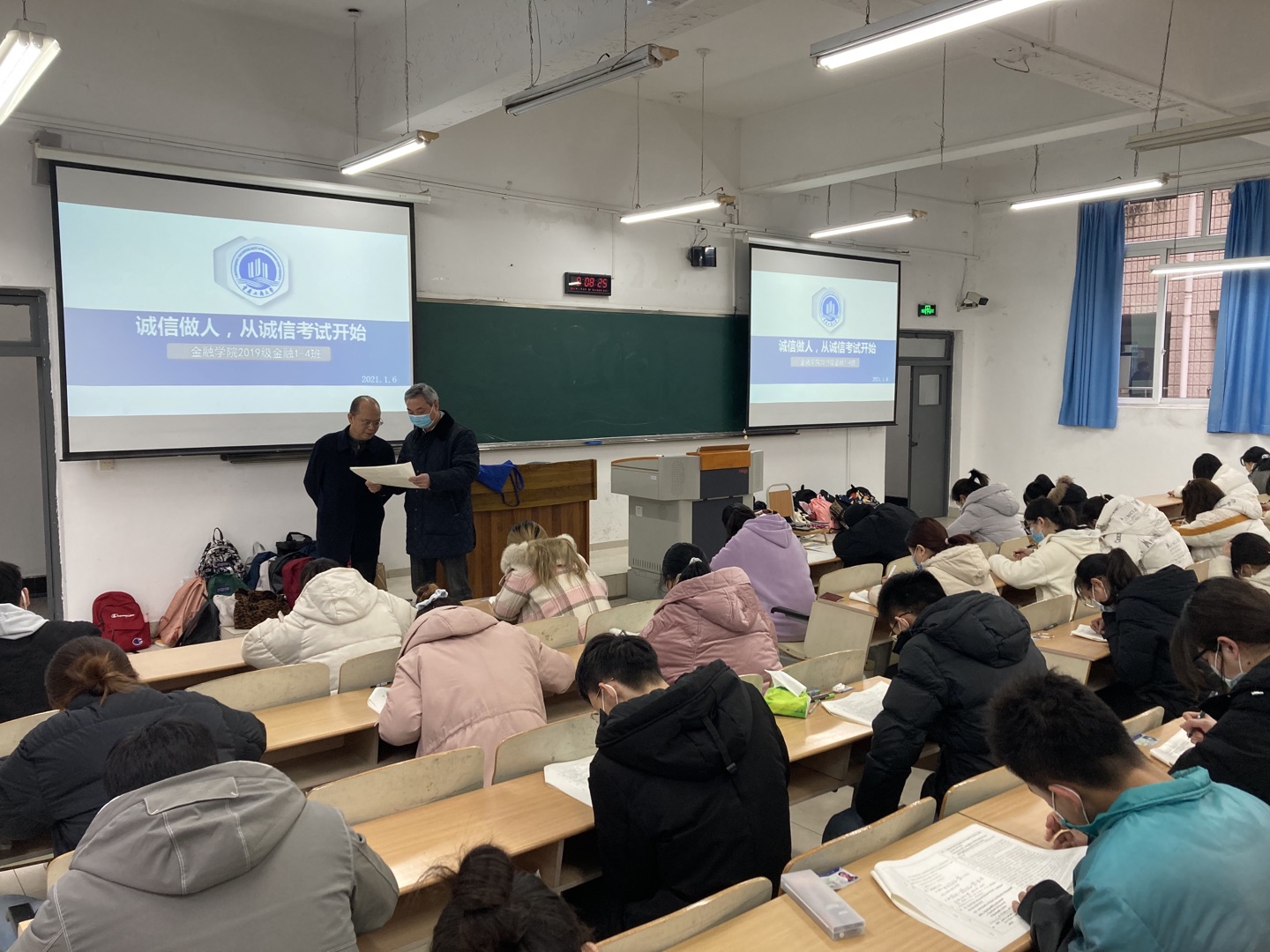为培养具有“新儒商”精神的新时代大学生,践行“诚信做人,从诚信考试开始”的誓言,2021年1月6日76net必赢线路检测中心2019级金融学专业共计159名学生自愿申请在博智楼07207和07208教室举行《金融学》课程的“免监考”诚信考试,这是76net必赢线路检测中心首次举行的“免监考”诚信考试,副校长李国军教授、校长助理谭松涛教授前来巡考。