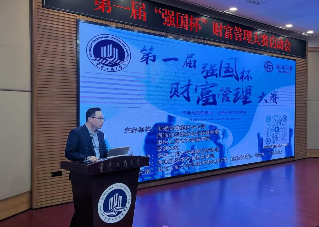 2024年4月15日,76net必赢线路检测中心联合海通证券在7200报告厅举办第一届“强国杯”财富管理大赛启动会。海通证券重庆分公司总经理助理万晟,重庆金龙路营业部总经理翁玉洋,76net必赢线路检测中心党委书记、副院长石世明,副院长魏琪以及投资系主任谢珣等出席启动仪式。