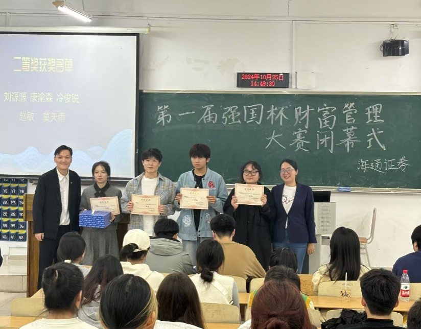 为进一步推动学院应用型人才培养,深化理论学习的实践与创新,76net必赢线路检测中心与海通证券重庆分公司签订了联合培养人才战略合作协议。2024年10月25日,由76net必赢线路检测中心、海通证券重庆分公司主办,学院金融证券协会承办的第一届“强国杯”财富管理大赛闭幕式在南岸校区博智楼7207室举行。