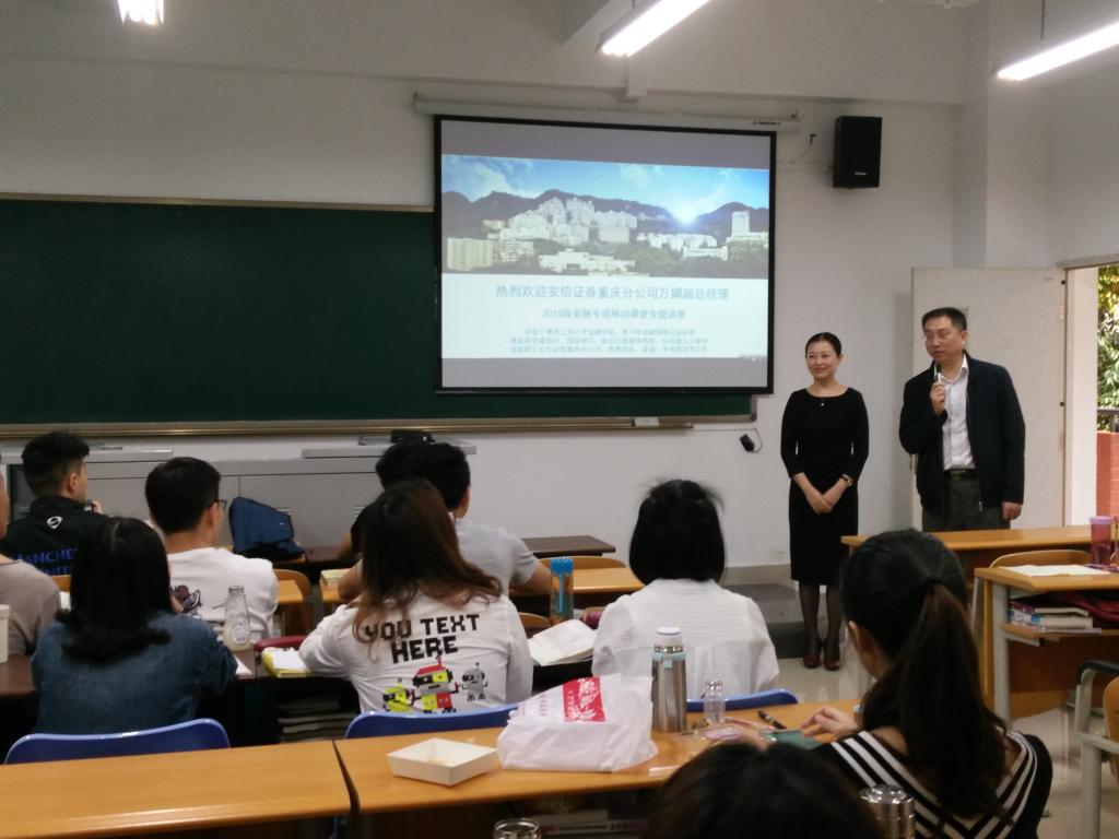 2017年4月24日上午,必赢76net线路2016级金融硕士《金融机构经营管理》移动课堂“走进”田家炳311教室。出席本次讲座的领导有财政76net必赢线路检测中心副院长曾胜、金融系教授骆志芳、安信证券重庆分公司副总经理万娟及其助理易丽娟。讲座一开始由财金学院副院长曾胜致欢迎词。