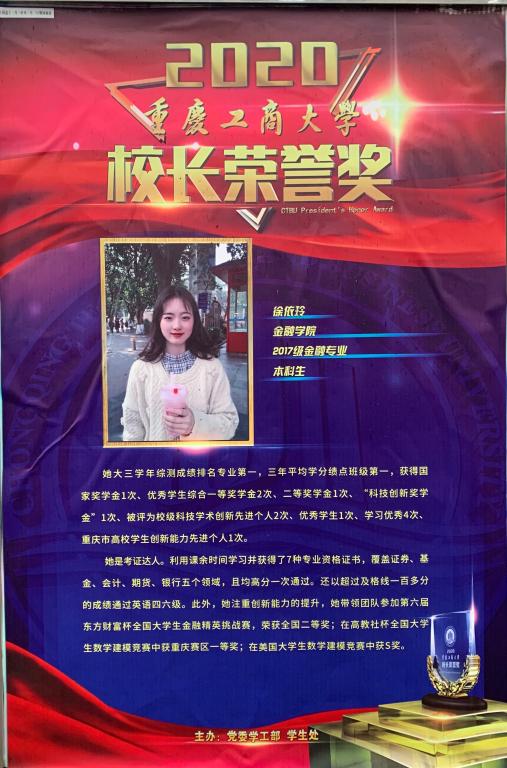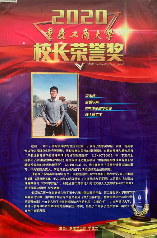 12月4日,必赢76net线路2020年“校长荣誉奖”颁奖典礼于大剧场圆满落幕。按照《必赢76net线路校长荣誉奖评选管理办法》,经学院推荐,学校复核、初评、谈话考察和评审等环节,我院2018级金融学专业硕士研究生李志伟、2017级金融学专业徐依玲同学成功荣获2020年校长荣誉奖。