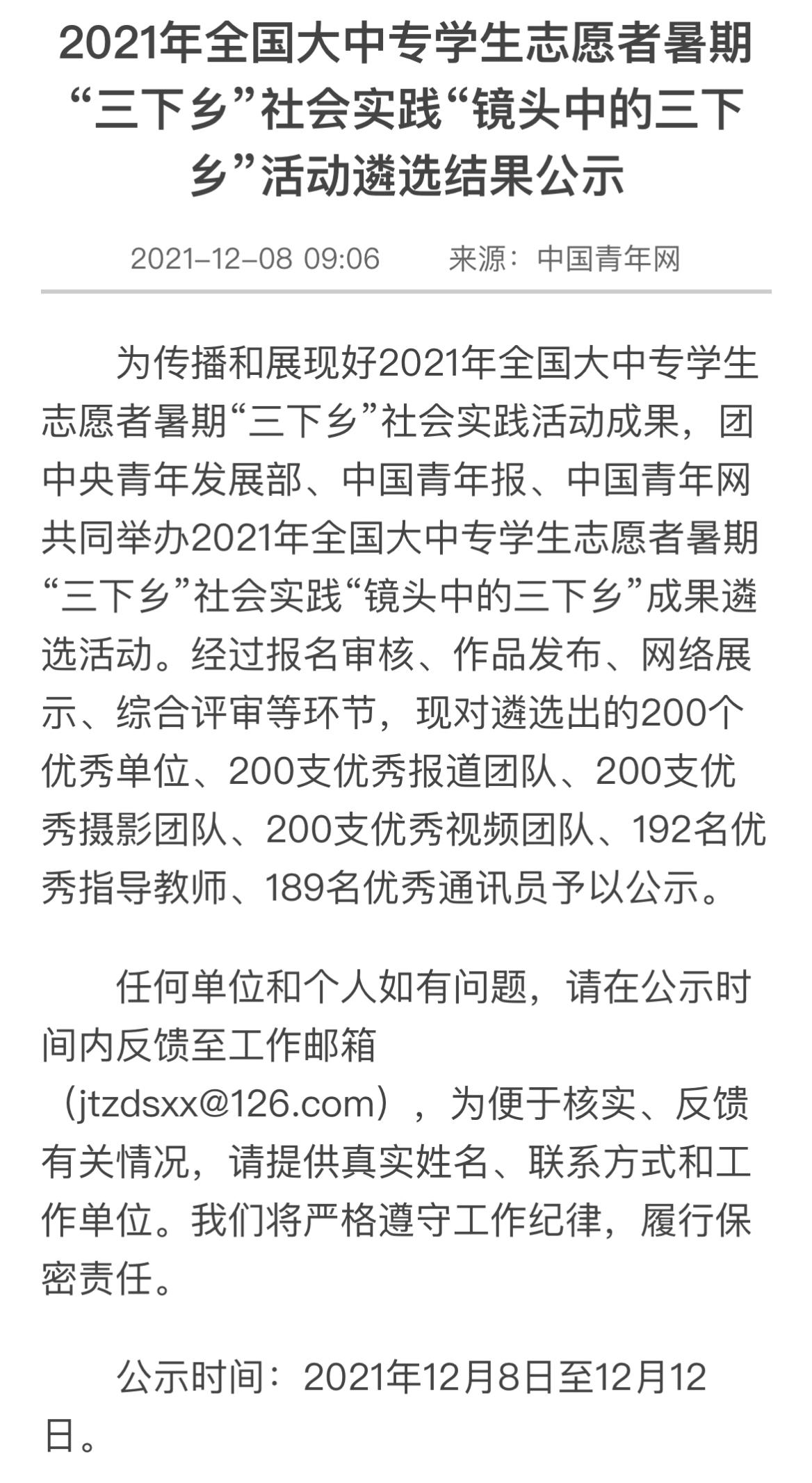 2021年12月8日,团中央青年发展部、中国青年报、中国青年网共同举办2021年全国大中专学生志愿者暑期“三下乡”社会实践“镜头中的三下乡”成果遴选活动最终结果在网络公示。76net必赢线路检测中心暑期“三下乡”社会实践团队“心系神州事 情融牡丹乡”国情观察实践团荣获“优秀视频团队”称号。