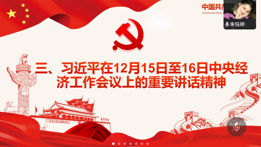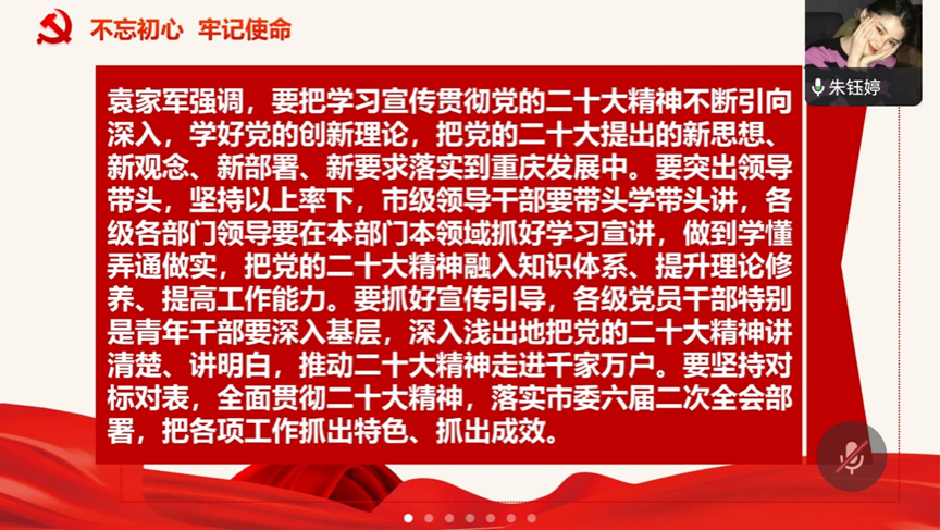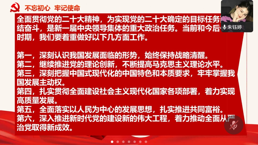朱钰婷同志带领大家学习习近平总书记重要文章《继承和发扬党的优良革命传统和作风 弘扬延安精神》,文章指出,这次和中央政治局常委同志一起来,就是要宣示新形成和发扬的光荣传统和优良作风,培育形成的以坚定正确的政治方向、解放思想实事求是的思想路线、全心全意为人民服务的根本宗旨、自力更生艰苦奋斗的创业精神为主要内容的延安精神,是党的宝贵精神财富,要代代传承下去。文章指出,坚定正确的政治方向是延安精神的精髓。全党同志要坚持正确政治方向,坚决贯彻党的基本理论、基本路线、基本方略,坚决落实党中央决策部署,把老一辈革命家开创的伟大事业继续推向前进。要站稳人民立场,践行党的宗旨,贯彻党的群众路线,保持党同人民群众的血肉联系,自觉把以人民为中心的发展思想贯穿到各项工作之中,扎实推进共同富裕,让现代化建设成果更多更公平惠及全体人民。要大力弘扬自力更生、艰苦奋斗精神,无论我们将来物质生活多么丰富,自力更生、艰苦奋斗的精神一定不能丢,脚踏实地、苦干实干,集中精力办好自己的事情,把国家和民族发展放在自己力量的基点上。要把老一辈革命家和共产党人留下的光荣传统和优良作风传承好发扬好,勇于推进党的自我革命,坚定不移推进全面从严治党,始终保持党的先进性和纯洁性,确保党始终成为中国特色社会主义事业的坚强领导核心。要发扬斗争精神、提高斗争本领,坚决战胜前进道路上的各种困难和挑战,依靠顽强斗争打开事业发展新天地。